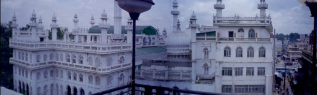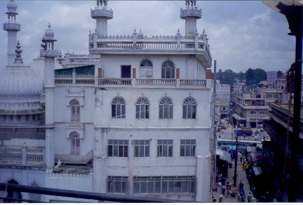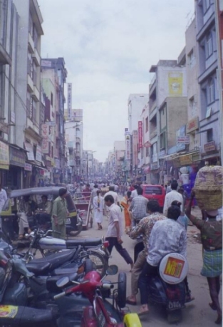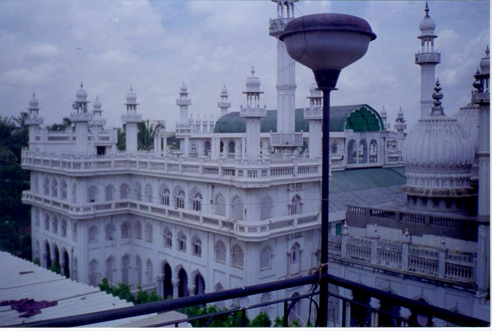 hotelleja, ravintoloita, kauppoja. Asuin Bangaloressa Silver Jubilee Park roadilla, joka oli muslimien aluetta, mistä kertoi mustissa hunnuissa kulkevat naiset ja taulu hotellini seinällä. Huone oli upealla paikalla neljännessä tai viidennessä kerroksessa. Huoneen ovi avautui suoraan parvekkeelle, josta oli näkymä hienoon moskeijaan sekä sen yli avautuvaan puistoon. Ja hintaa huoneella oli vain 60 rupiaa päivässä, mikä oli laatuun nähden aika hyvin. Intiassa Islamkin tuntui kovin tutulta ja turvalliselta verrattuna kaaottiseen ja tuntemattomaan hindulaisuuteen... Muualta Bangaloresta löytyi kyllä sitten hindulaisia ja kristittyjäkin, kuten esimerkiksi ajoneuvokorjaamon nimi "Infant Jesus Motors" kertoi...